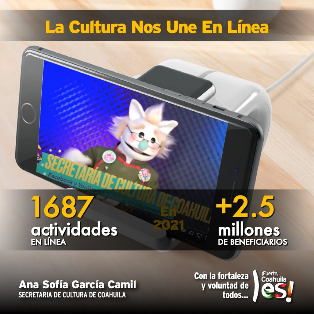 “Por medio de este programa, en 2021 realizamos mil 687 actividades culturales y talleres digitales que disfrutaron más de 2 millones y medio de personas, ganando diariamente nuevas audiencias, las cuales diariamente siguen aumentando, puesto que las presentaciones en línea se realizan diariamente y quedan grabadas para que quienes no las pudieron ver en vivo puedan disfrutarlas posteriormente”, informó Ana Sofía García Camil, titular de la Secretaría de Cultura.