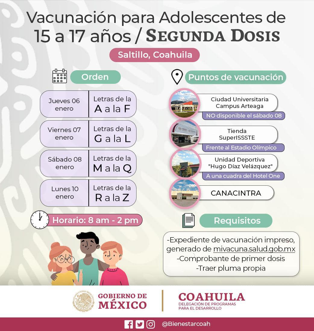 Este jueves 6 de enero arrancará la jornada de vacunación de segunda dosis para adolescentes de 15 a 17 años de edad en Saltillo, según informó la Delegación Coahuila de la Secretaría del Bienestar.