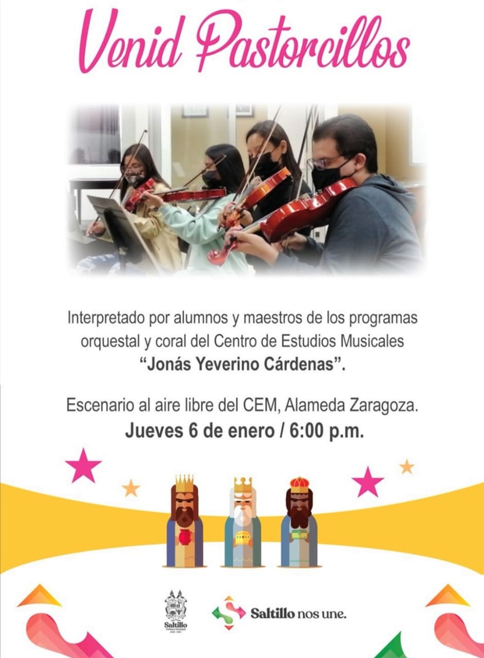 Este jueves a las 6:00 de la tarde, el Centro de Estudios Musicales (CEM) «Jonás Yeverino Cárdenas» del Instituto Municipal de Cultura de Saltillo (IMCS) abrirá sus puertas para ofrecer al público en general el recital «Venid Pastorcillos», interpretado por sus alumnos y maestros de los programas Orquestal y Coral.