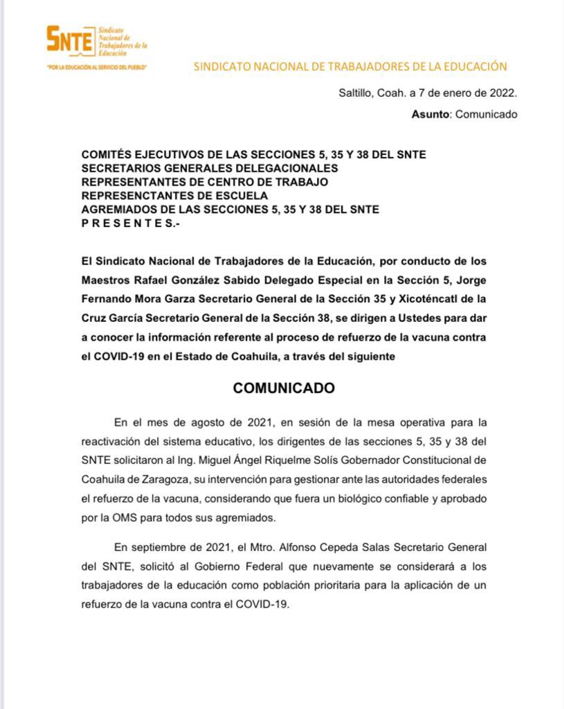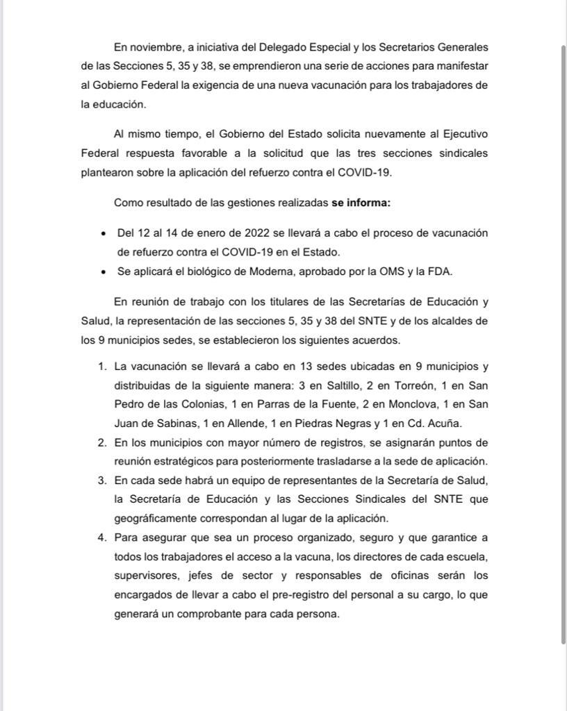 Será del 12 al 14 de enero de 2022 en que se llevará a cabo el proceso de vacunación de refuerzo contra el COVID-19 para personal educativo de Coahuila, en donde se aplicará el biológico de Moderna, aprobado por la OMS y la FDA.
