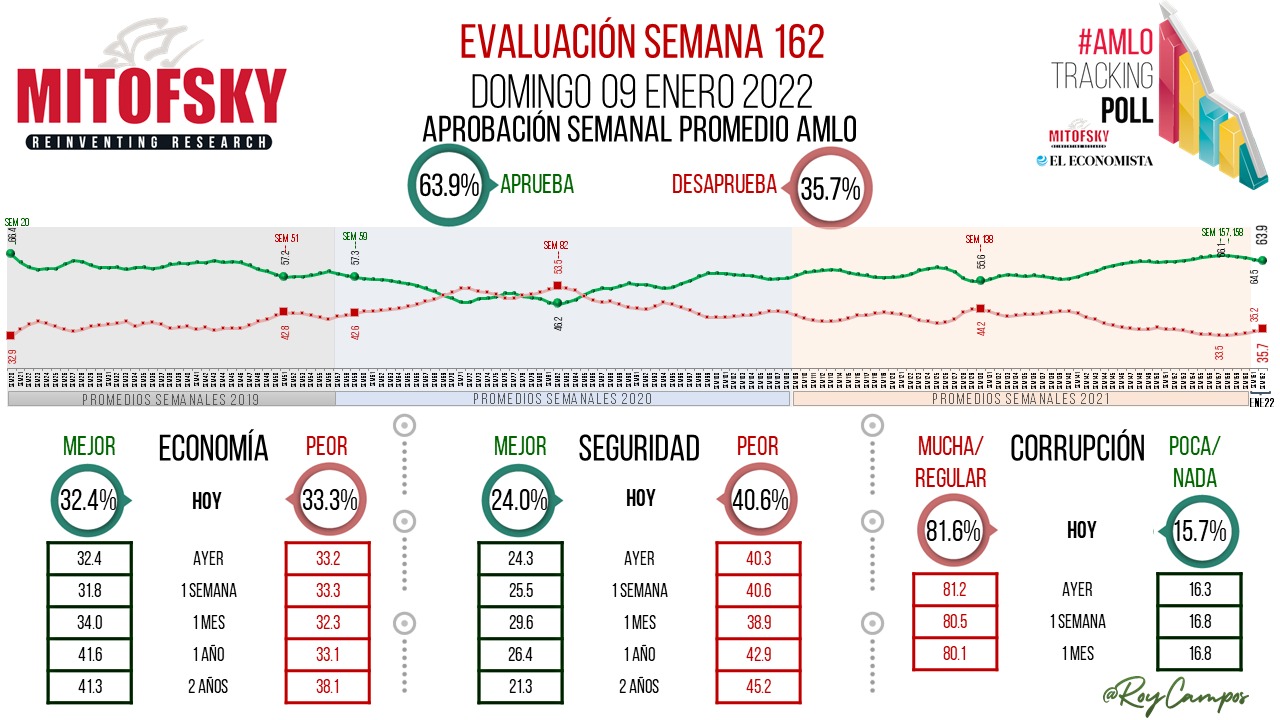 De acuerdo con el reporte semanal de Consulta Mitofsky, el 33.3% de los mexicanos piensa que la economía está peor ahora, contra un 32.4% que opina que está mejor. Hace un año, el 41.6% pensaba que estaba mejor, peso esa cifra se ha desplomado a raíz de los malos resultados en materia económica obtenidos por este gobierno, los cuales se han reflejado en una galopante inflación, desempleo, y mayores índices de pobreza.