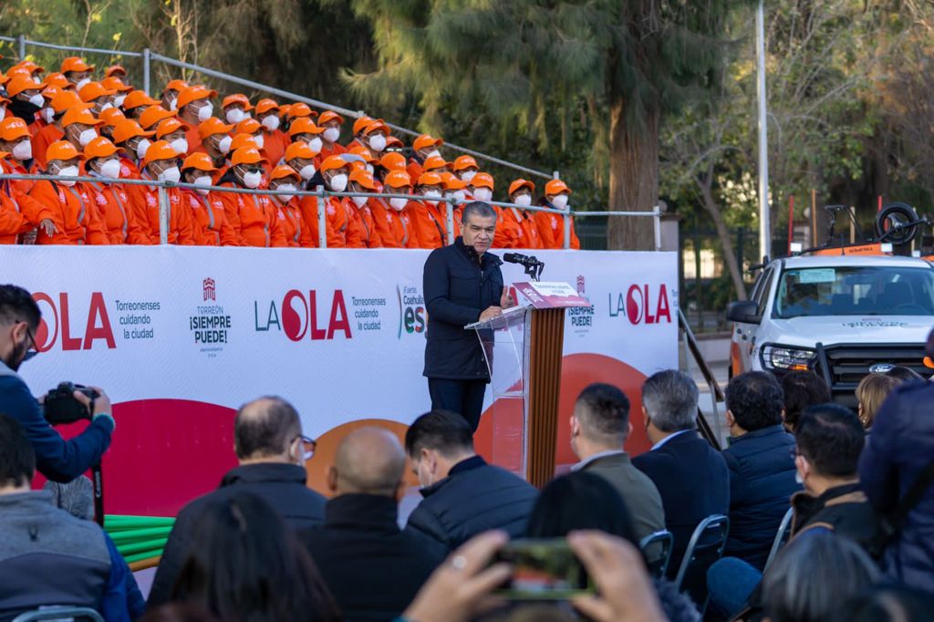 Torreón, Coahuila.- El gobernador Miguel Ángel Riquelme Solís arrancó el Programa de Empleo Temporal “La Ola”, Torreonenses cuidando la ciudad, evento en el que se entregaron 14 vehículos equipados para atender todos los puntos de la ciudad.