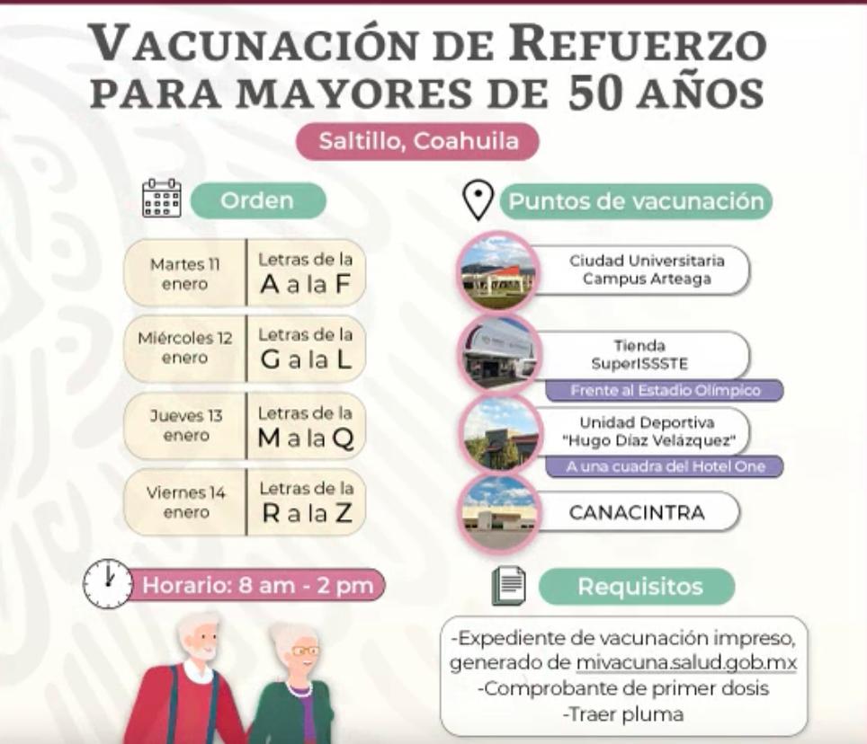 Este martes dará comienzo la jornada de vacunación para la aplicación del refuerzo a mayores de 50 años en Saltillo, según lo dio a conocer la Delegación Coahuila de la Secretaría del Bienestar.