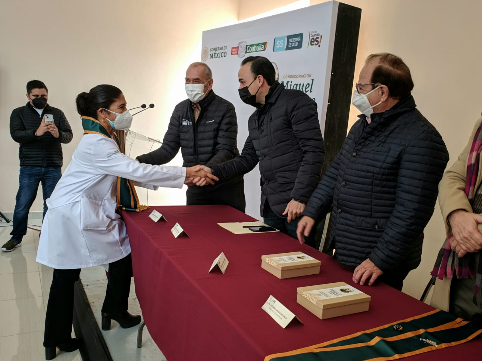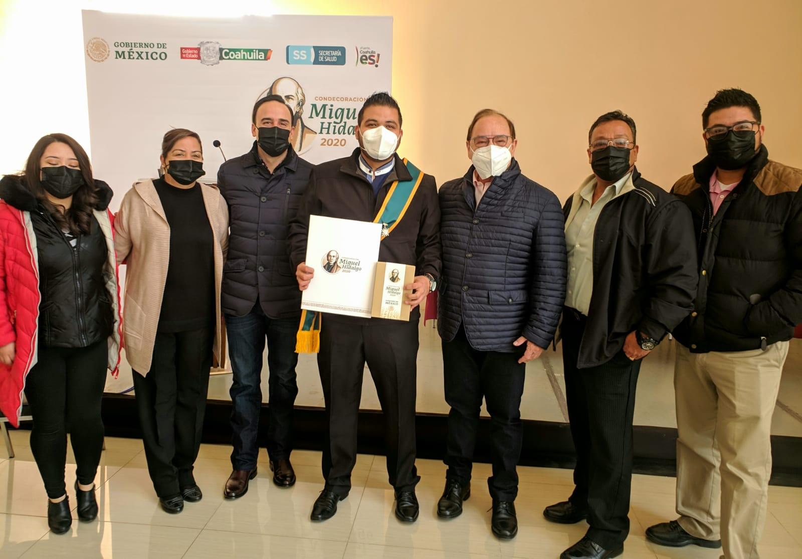 Roberto Bernal Gómez, Secretario de Salud de Coahuila, y Manolo Jiménez Salinas, en representación del gobernador Miguel Ángel Riquelme, entregan Presea ‘Miguel Hidalgo’ a profesionales de la salud