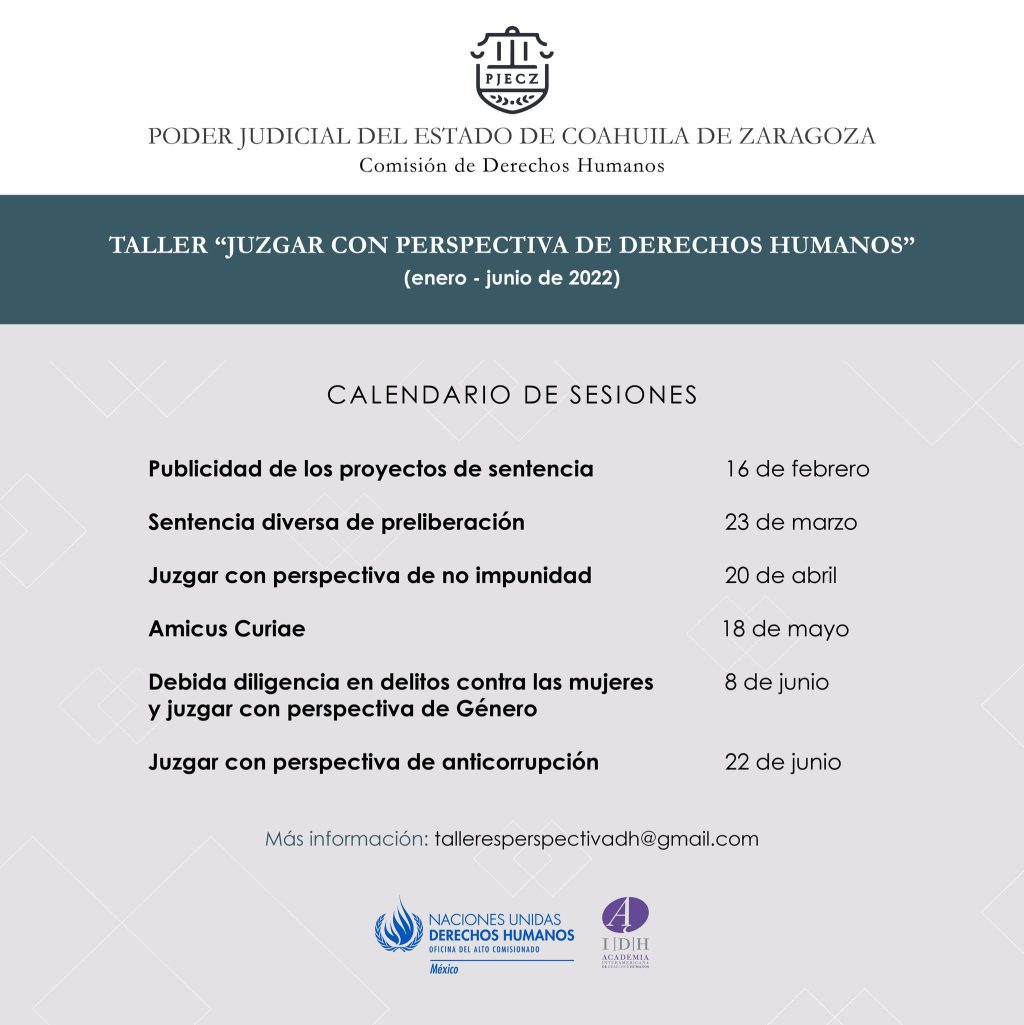 La Academia Interamericana de Derechos Humanos de la Universidad Autónoma de Coahuila, en conjunto con el Poder Judicial del Estado, la Comisión de Derechos Humanos y la Oficina del Alto Comisionado de las Naciones Unidas para los Derechos Humanos México, invitan a la comunidad universitaria y al público en general a participar en el taller “Juzgar con Perspectiva de Derechos Humanos” edición enero-junio 2022.