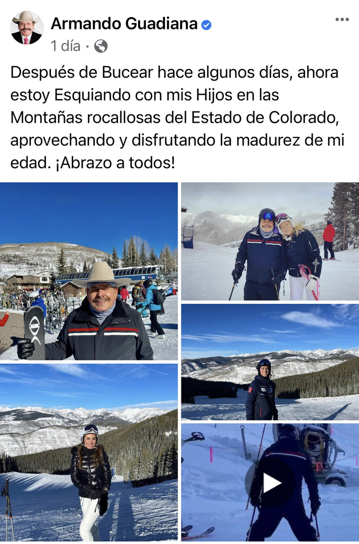 “Después de bucear hace algunos días, ahora estoy esquiando con mis hijos en las montañas rocallosas del estado de Colorado, aprovechando y disfrutando la madurez de mi edad. ¡Abrazo a todos!” publicó el senador por Morena, Armando Guadiana, en sus redes sociales, junto con unas fotografías y un video en las que se ven a él y a su familia disfrutando en un exclusivo centro de esquí en los Estados Unidos.