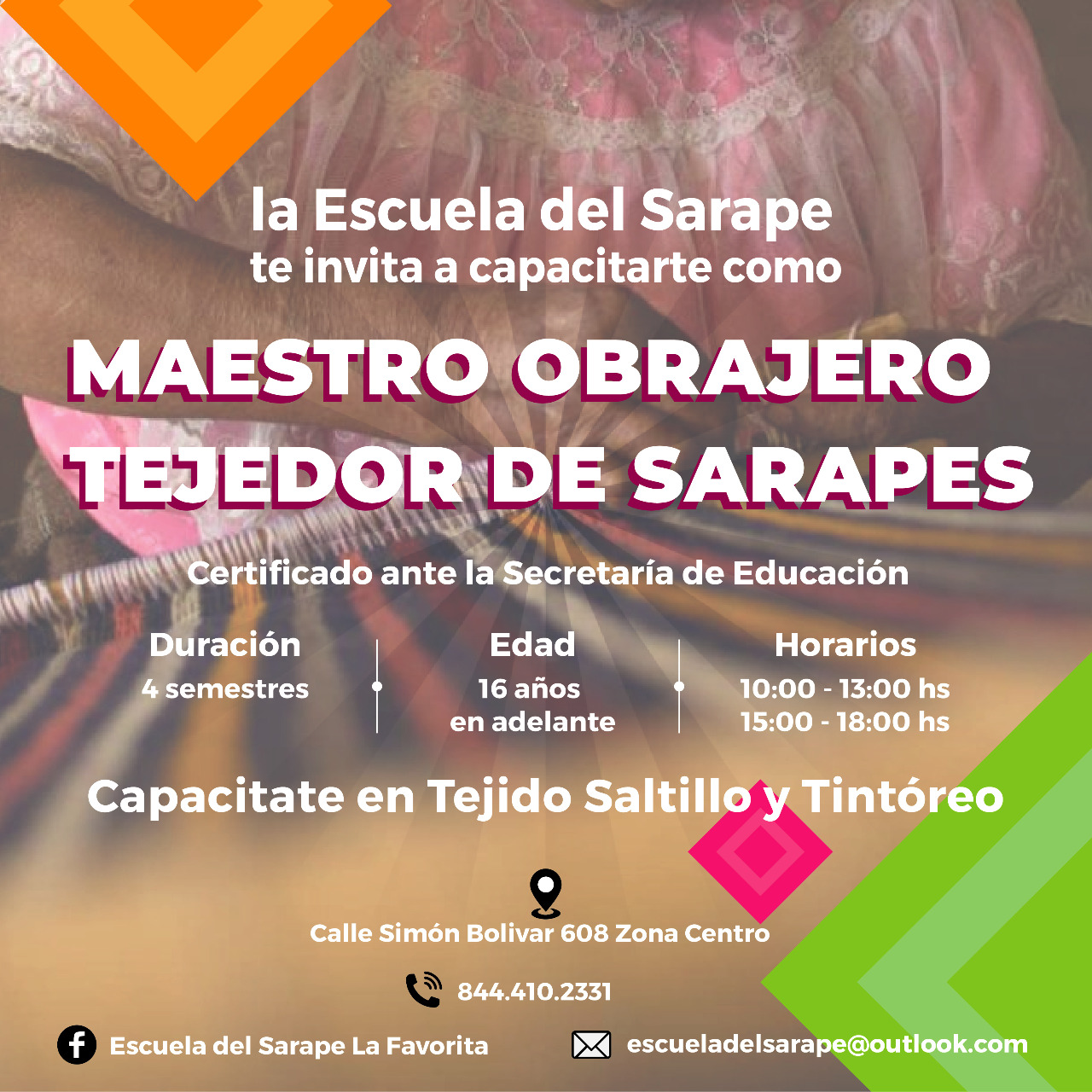 Con el objetivo de recuperar técnicas tradicionales, trasmitir y difundir una cultura de conservación e innovación del sarape, la Secretaría de Cultura de Coahuila, a través de la Escuela del Sarapec invita a inscribirse en su próximo período escolar a las personas interesadas en aprender labores de Tejido Saltillo y tintóreo con productos naturales para la producción de sarapes.