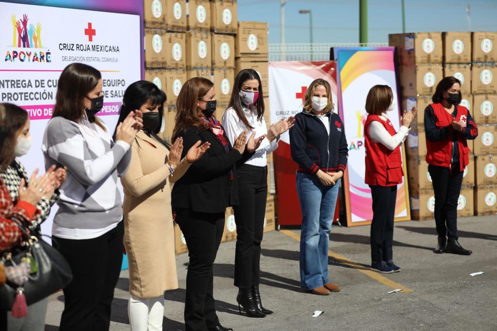 La iniciativa ciudadana Apoyaré, que preside Paola Rodríguez López, esposa del ex alcalde de Saltillo y actual secretario de Inclusión y Desarrollo Social, Manolo Jiménez Salinas, donó a la Cruz Roja de Coahuila insumos de protección y equipo médico con valor de 31 millones de pesos para las 11 sedes que la institución tiene en el estado.