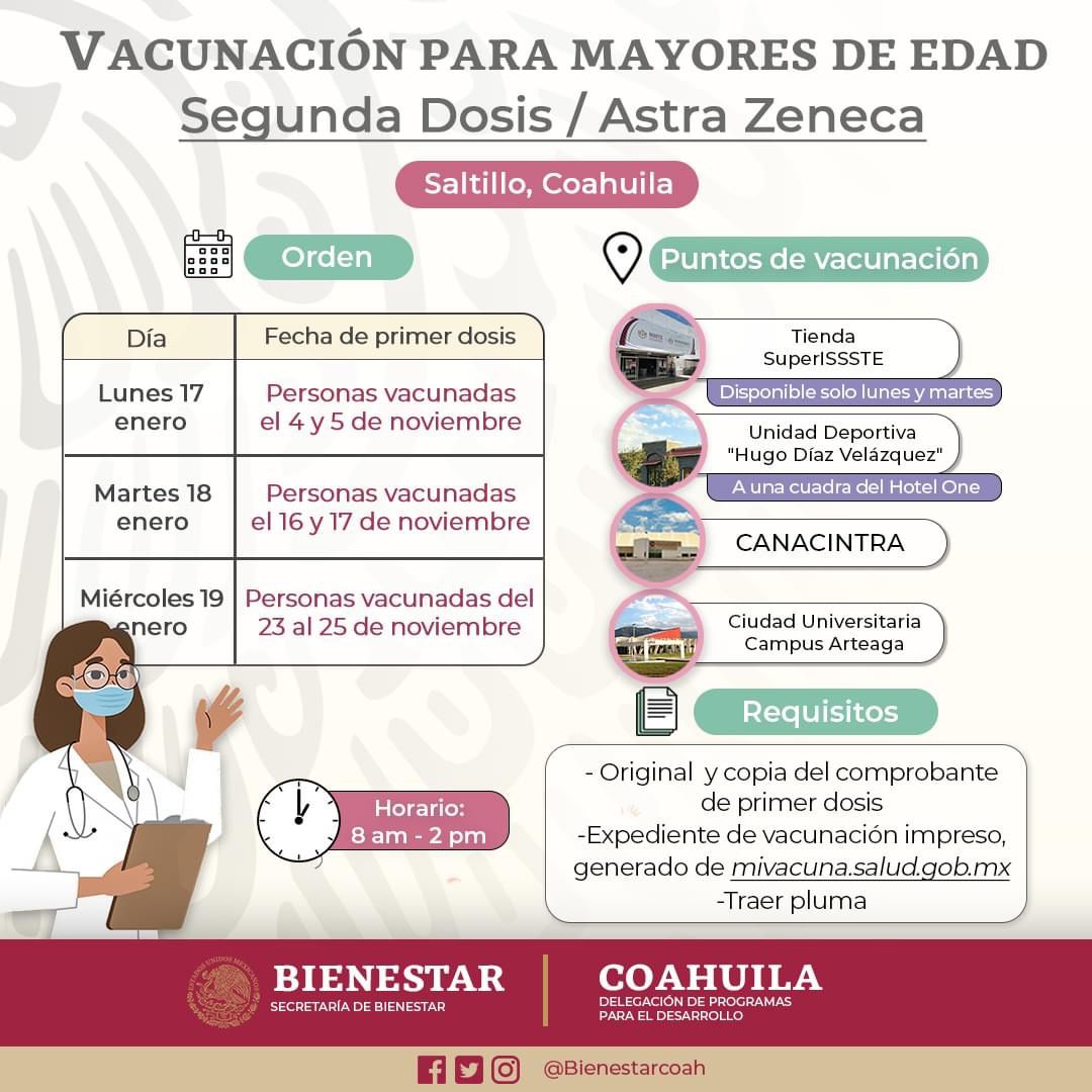 La Secretaría del Bienestar en Coahuila informó que a partir de este lunes se aplicará la segunda dosis contra la Covid-19 de la farmacéutica AstraZeneca a mayores de 18 años en adelante que hayan recibido su primera vacuna en noviembre.