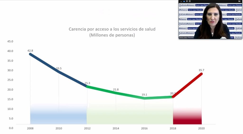 Con el presidente Enrique Peña llegó a bajar hasta 20 millones. Hoy, tres años después de este gobierno inhumano, hemos pasado de 20 millones a casi 36 millones de personas que no tiene la posibilidad de un doctor o medicinas. El gobierno disque humanista de López Obrador incrementó más del 76 por ciento de mexicanos que no pueden acceder a un derecho humano como lo es, la salud, aseguró la legisladora.