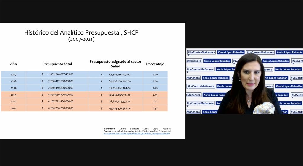 López Rabadán presentó una tabla en la que se muestra el presupuesto asignado por el PAN en 2007, 2008 y 2009, así como por Morena en sus primeros tres años 2019, 2020 y 2021, demostrando que en el gobierno panista se invirtió un porcentaje mayor del total del Presupuesto Egresos de la Federación.