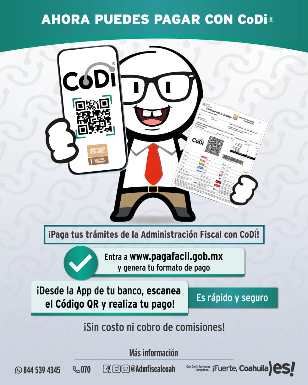 Javier Díaz González, Administrador Fiscal de Coahuila, compartió que se agregó CoDi como nuevo método de pago para los trámites realizables de la AFG.