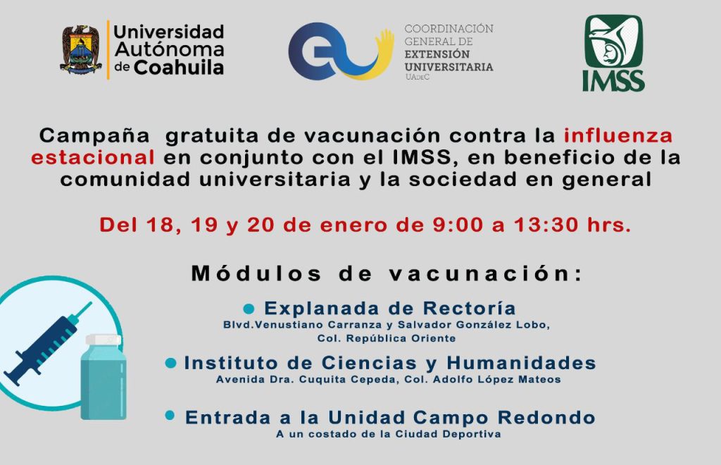 De acuerdo con la vinculación que se tiene con el Instituto Mexicano del Seguro Social, la Universidad Autónoma de Coahuila, instalará tres módulos de aplicación para la vacunación contra la influenza estacional los días 18, 19 y 20 de enero de 2022.