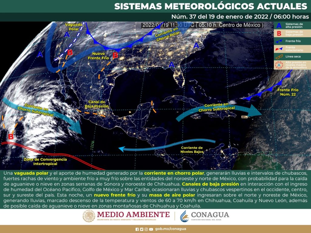 De acuerdo al Servicio Meteorológico Nacional, una vaguada polar sobre el noroeste del país, interacciona con el aporte de humedad favorecido por la corriente en chorro polar, generarán lluvias e intervalos de chubascos, fuertes rachas de viento y ambiente frío a muy frío sobre las entidades del noroeste y norte del territorio nacional.