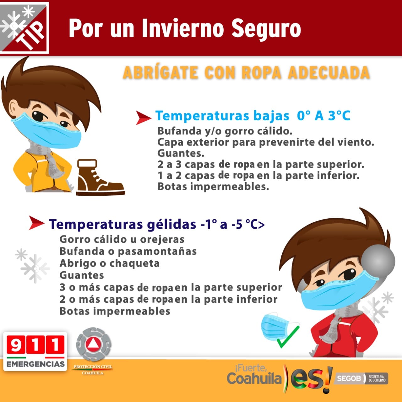 + Abrígate con ropa adecuada (gorro, bufanda, tapabocas, guantes, chamarra, etc.) y permanece dentro de lo posible en lugares cerrados.