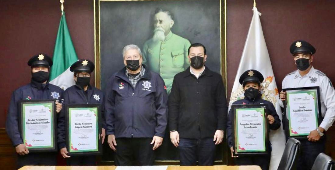 El alcalde también reconoció a Jesús Aguillón Bustos y Ángeles Alvarado Arredondo, ambos elementos de tránsito, quienes el 15 de enero rescataron a una mujer del interior de su vehículo al quedar atrapada luego de chocar contra las ballenas divisorias.