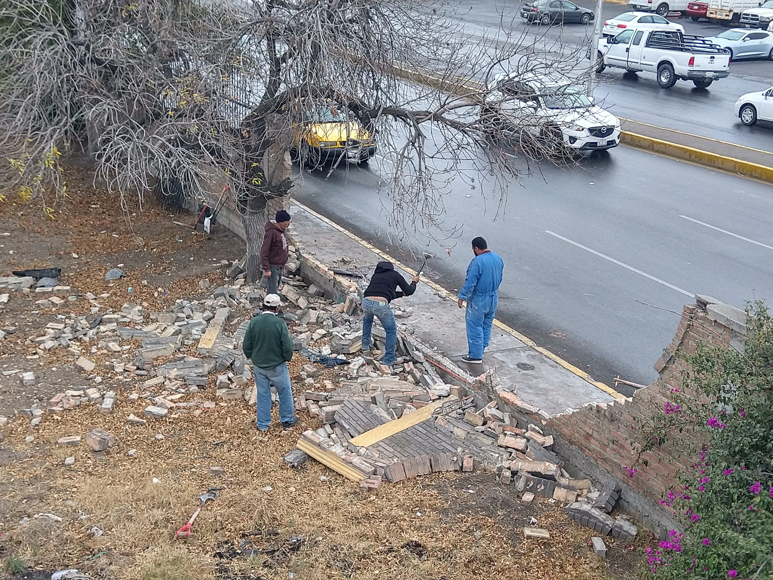 Una cuadrilla de trabajadores acudió horas después del percance para retirar los escombros resultado de este accidente y llevar a cabo las labores de medición y los cálculos de material para comenzar lo antes posible con la reconstrucción de esta barda, que tiene poco más de doce años de haber sido construida para delimitar los terrenos de la parroquia, cuando se realizaron las obras de ampliación del periférico Echeverría, al sur de la ciudad.