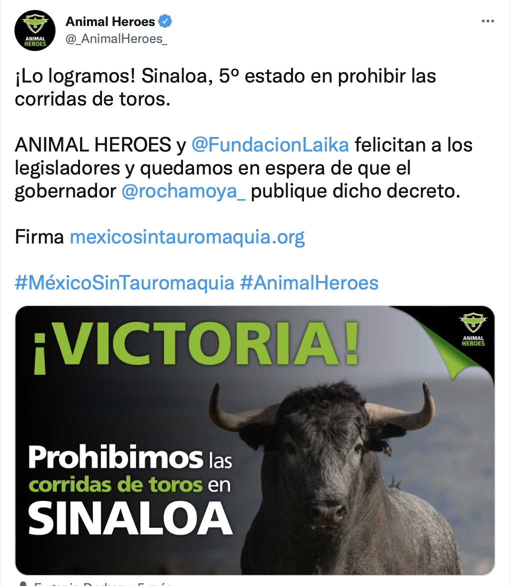 “Celebramos que Sinaloa se ha convertido en el quinto estado en prohibir esta cruel tradición. Ahora vamos por la Ciudad de México, hasta lograrlo en todo el país”, comentó Antonio Franyuti, Director General de Animal Heroes.