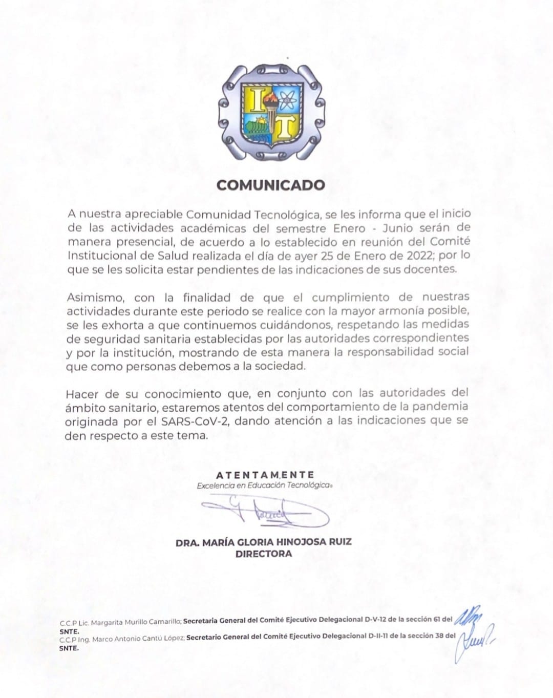 Por medio de un comunicado emitido este miércoles, la directora del Instituto Tecnológico de Saltillo (ITS), María Gloria Hinojosa Ruiz, informó que «las actividades académicas del semestre Enero-Junio serán de manera presencial», por lo que instó a su comunidad estudiantil a mantenerse al pendiente de las indicaciones de sus docentes para este efecto.