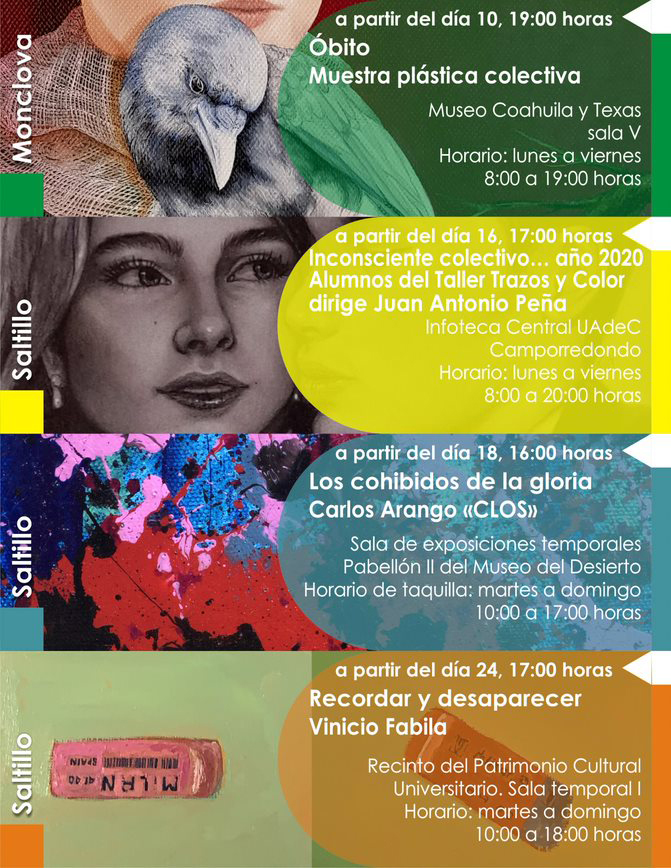 Todas las actividades presenciales son de entrada libre y se realizarán bajo los protocolos sanitarios correspondientes y con cupo limitado, se recomienda a los asistentes utilizar en todo momento el cubrebocas y gel antibacterial; para más información, visitar las redes sociales de la Coordinación de Difusión y Patrimonio Cultural de la UAdeC, en Twitter como @dpcuadec y en Facebook como “Dpc.UAdeC”. (EL HERALDO)
