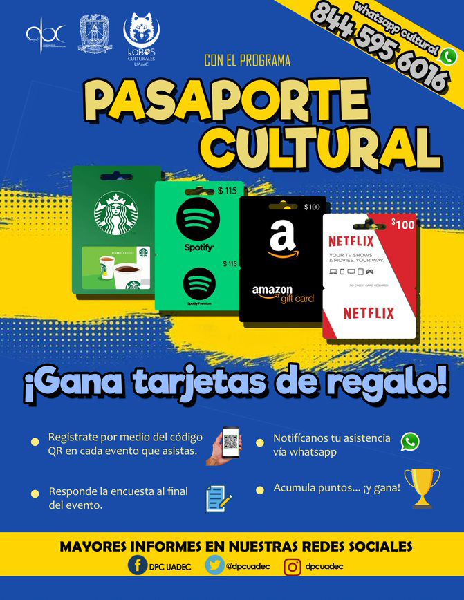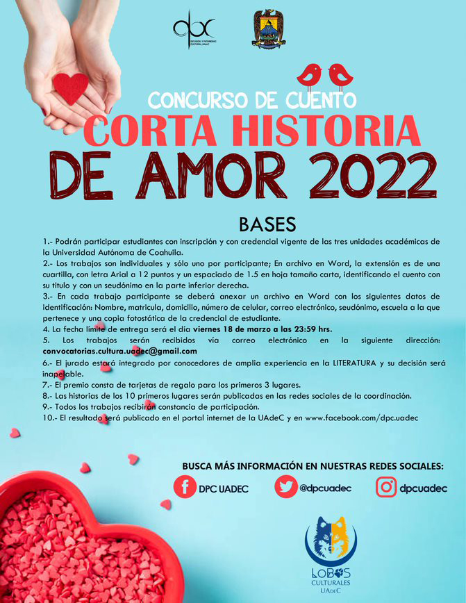 Así mismo, se abre la convocatoria para el concurso de cuento breve “Corta historia de amor 2022” consulta las bases de participación en el Facebook de la Coordinación General de Difusión y Patrimonio Cultural Dpc Uadec @dpc.uadec y se invita a la comunidad universitaria a participar en el programa “Pasaporte Cultural” informes al WhatsApp (844) 595 60 16.