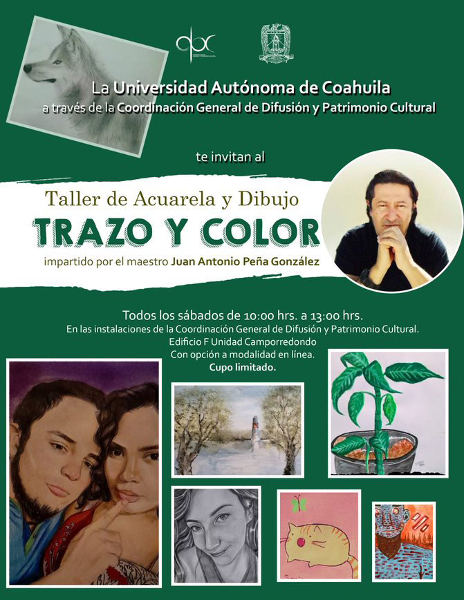Por otra parte, en las instalaciones de la Coordinación General de Difusión y Patrimonio Cultural en el edificio “F» en Unidad Camporredondo, todos los sábados de 10:00 a 13:00 horas se impartirá el taller de acuarela y dibujo “Trazo y color” por el Mtro. Juan Antonio Peña González.