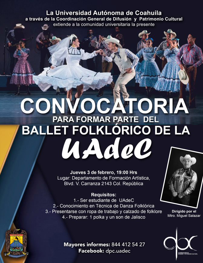 Para iniciar, el jueves 3 de febrero a las 19:00 horas en el Bulevar Venustiano Carranza #2143 en el Departamento de Grupos y Talleres se llevarán a cabo las audiciones para integrarse al grupo representativo de Ballet Folclórico, por lo que se convoca a alumnos de la UA de C con conocimientos previos en la técnica de baile a participar, pueden comunicarse al teléfono (844) 412 54 27 con el Mtro. Miguel Ángel Salazar Valdés.