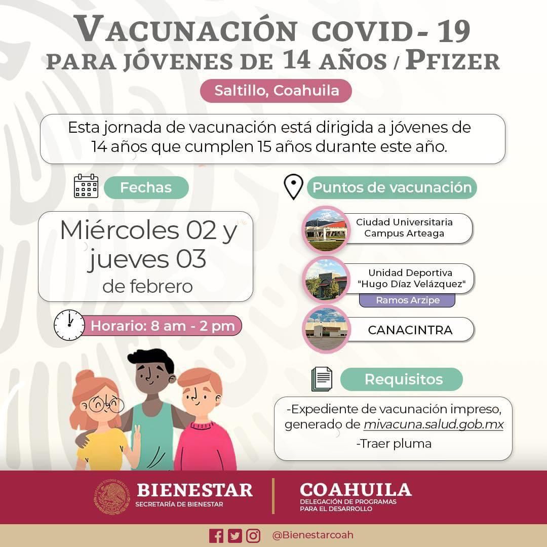 Este miércoles 2 y jueves 3 de febrero se llevara a cabo la jornada de vacunación antiCovid para adolescentes de 14 años en Saltillo.