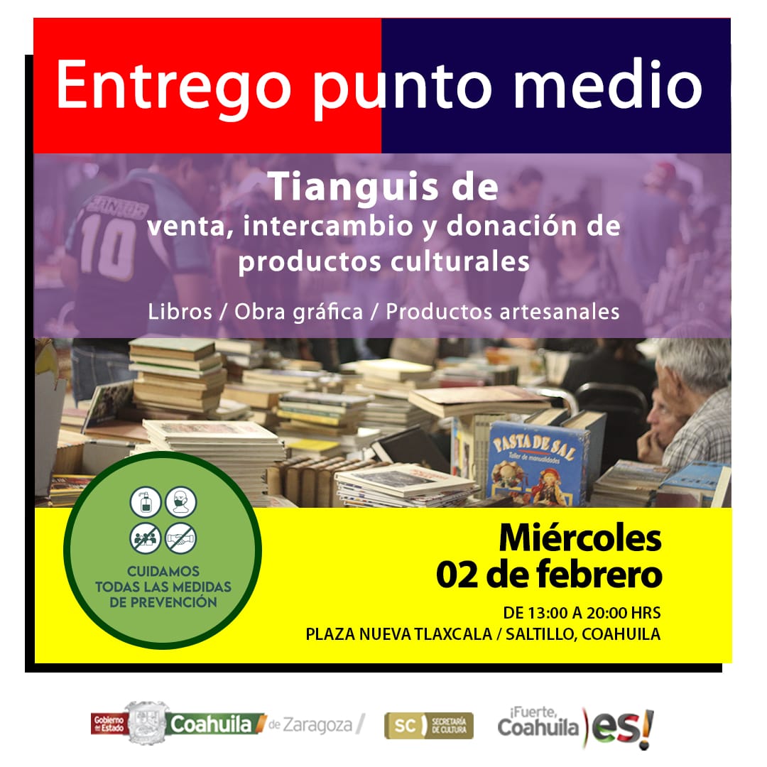 Luego de que no pudo llevarse a cabo este viernes por las bajas temperaturas que se registraron en Saltillo, este próximo 2 de febrero de 1:00 de la tarde a 8:00 de la noche se llevará a cabo el tianguis cultural «Entrego Punto Medio», organizado por la Secretaría de Cultura de Coahuila con la finalidad de generar principalmente venta, intercambio y donación de libros en la Plaza Nueva Tlaxcala de la capital coahuilense. Asimismo, en este evento de entrada gratuita estarán a la venta fotografías, pinturas, esculturas, obra gráfica y productos artesanales creados por artistas locales.