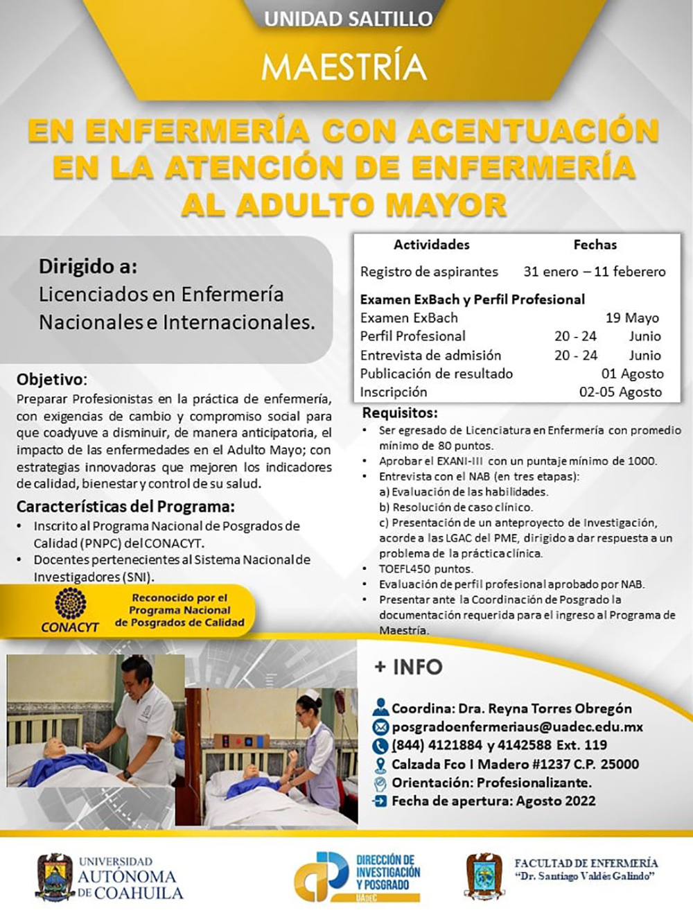 La Facultad de Enfermería “Dr. Santiago Valdés Galindo” de la Universidad Autónoma de Coahuila, convoca a ser parte de la Maestría en Enfermería con Acentuación en Atención de Enfermería al Adulto Mayor para el semestre agosto-diciembre 2022.