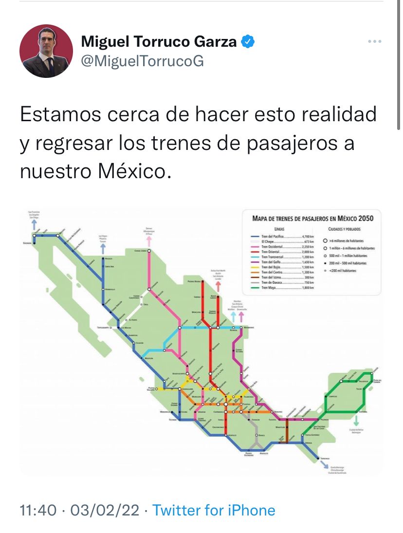El diputado federal de Morena, Miguel Torruco Garza, hijo del actual secretario de Turismo Federal, Miguel Torruco Márques aseguró en su cuenta de Twitter que existe un proyecto para ‘conectar’ con trenes de pasajeros a todo el país, por medio de diferentes vías que unirían prácticamente todo el territorio, incluyendo ciudades de Coahuila como Saltillo, Parras de la Fuente, La Laguna, Monclova y Piedras Negras.