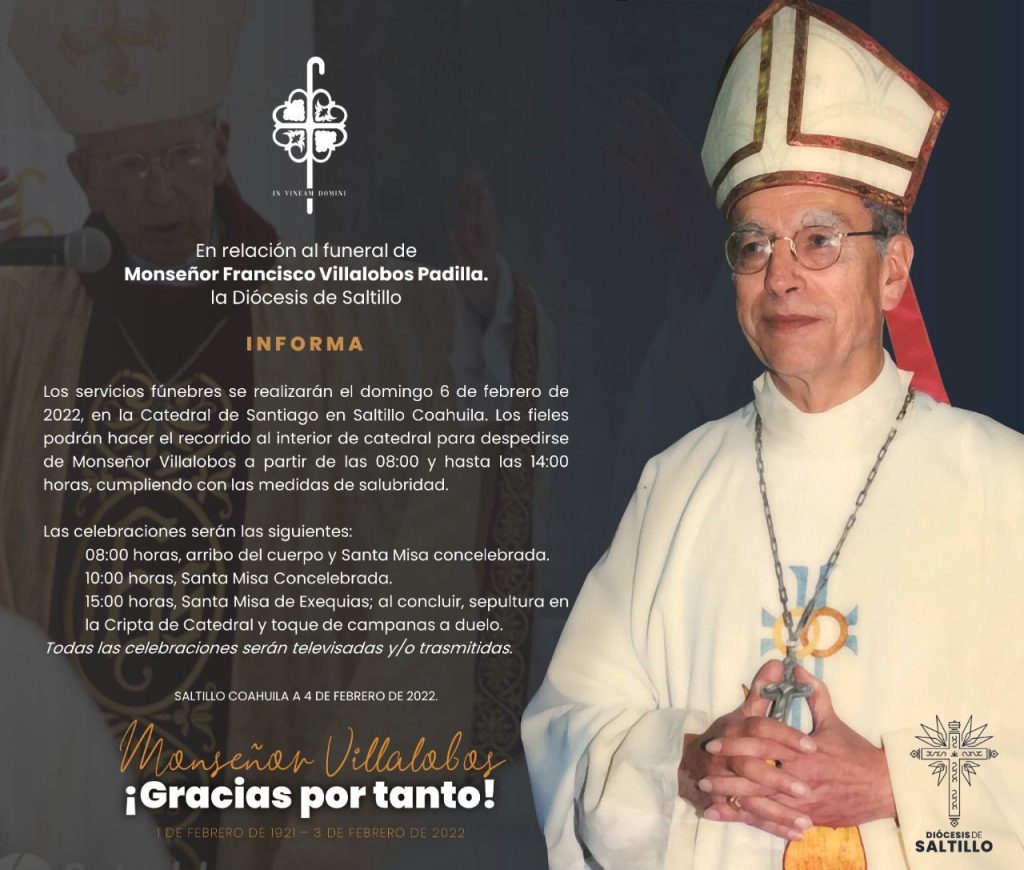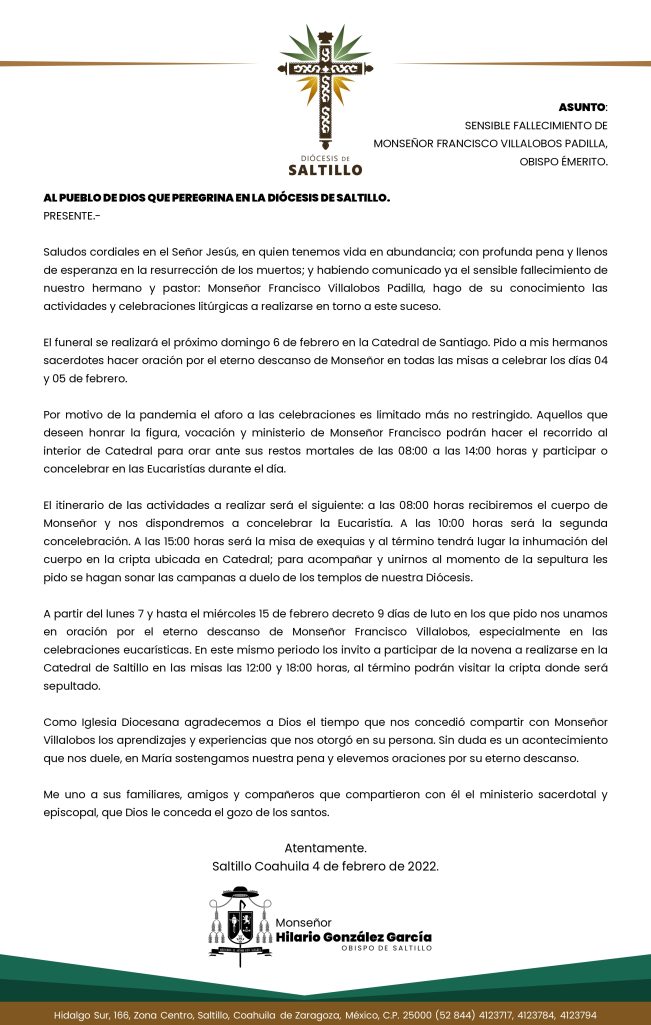 La tarde de este viernes, por medio de un comunicado, el obispo de la Diócesis de Saltillo, Hilario González García, informó que el funeral del obispo emérito Francisco Villalobos Padilla, quien falleció la noche de este jueves, se efectuará este domingo en la Catedral de Santiago, en Saltillo.