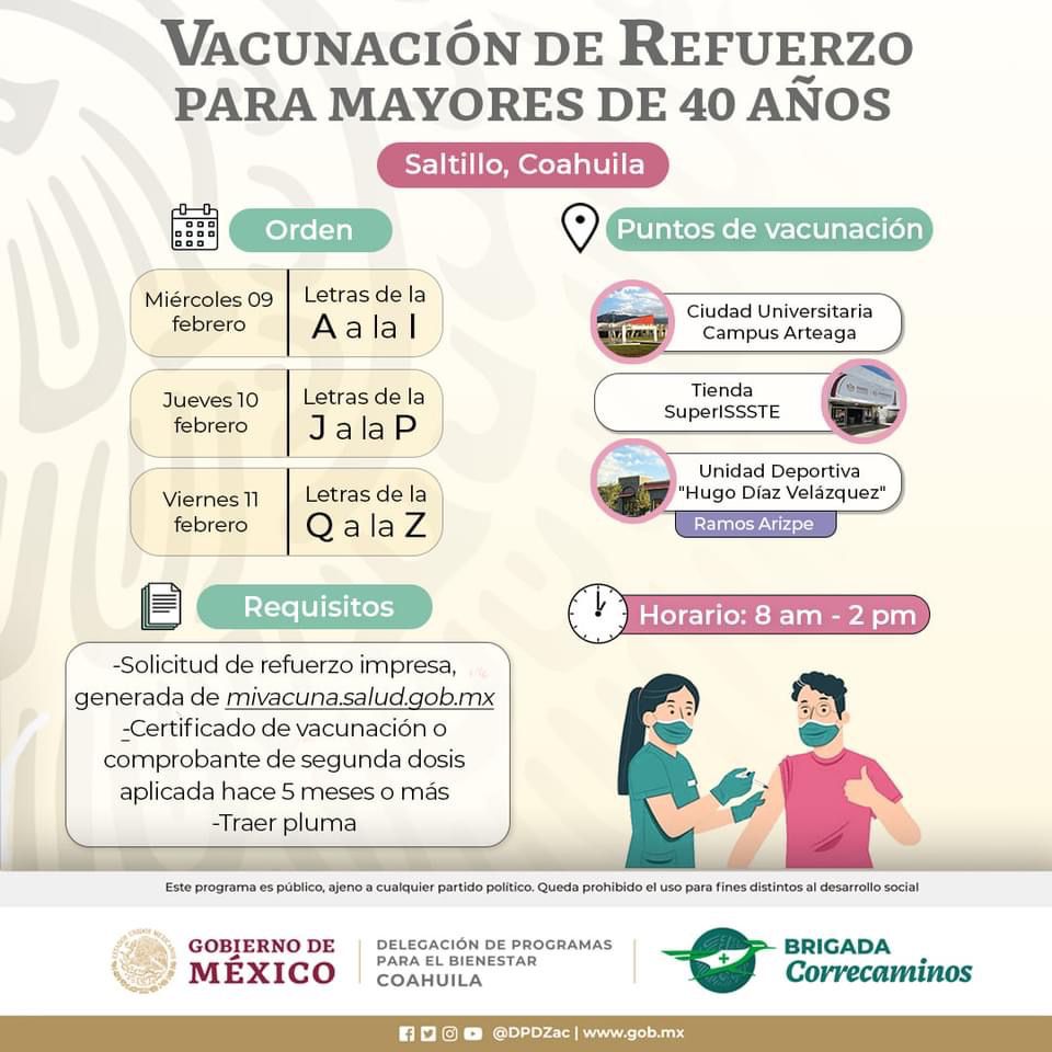 Por su parte, el 9, 10 y 11 de febrero se realizará la jornada de vacunación de refuerzo para mayores de 40 años. Para tal efecto se contará con tres puntos de vacunación: la Tienda SuperISSSTE en Saltillo; Ciudad Universitaria Campus Arteaga en Arteaga, y la Unidad Deportiva “Hugo Díaz Velázquez” en Ramos Arizpe.
