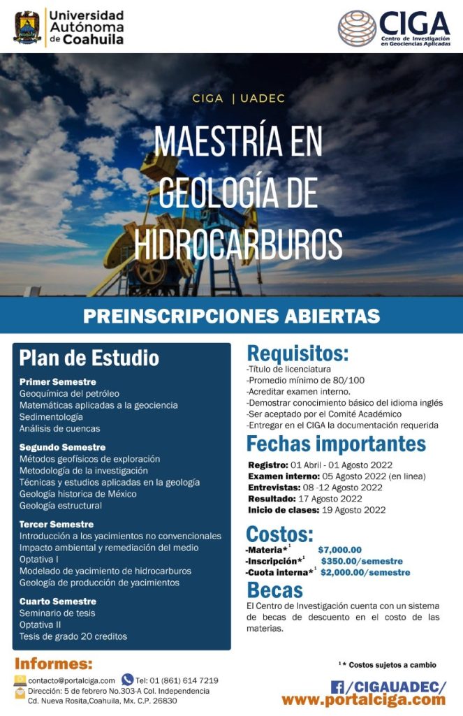Nueva Rosita, Coahuila.- El Centro de Investigación en Geociencias Aplicadas (CIGA) de la Universidad Autónoma de Coahuila, convoca a egresados de Ciencias de la Tierra o áreas afines, a estudiar la Maestría en Geología de Hidrocarburos a partir del semestre agosto-diciembre 2022.