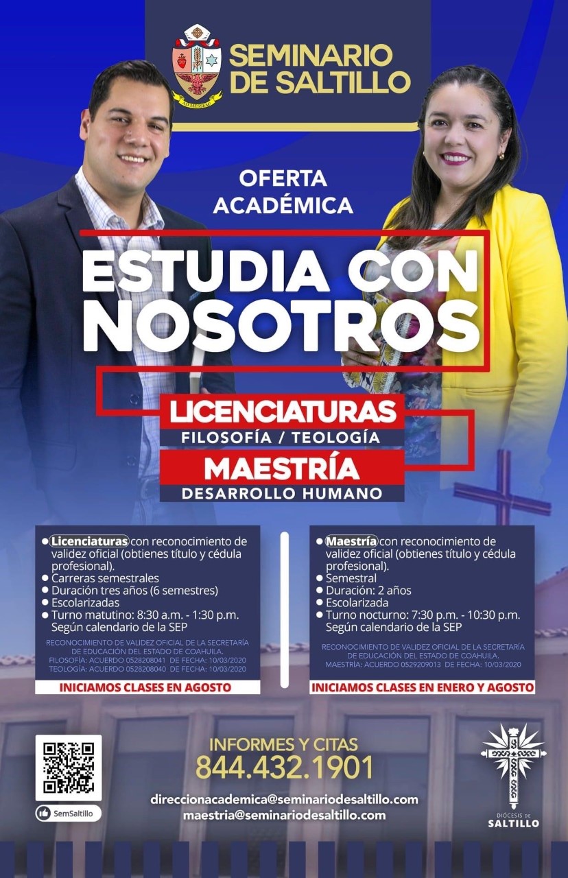 El obispo de la Diócesis de Saltillo, Hilario González García dio a conocer que se encuentran disponibles las licenciaturas de filosofía y teología, así como una maestría en desarrollo humano.