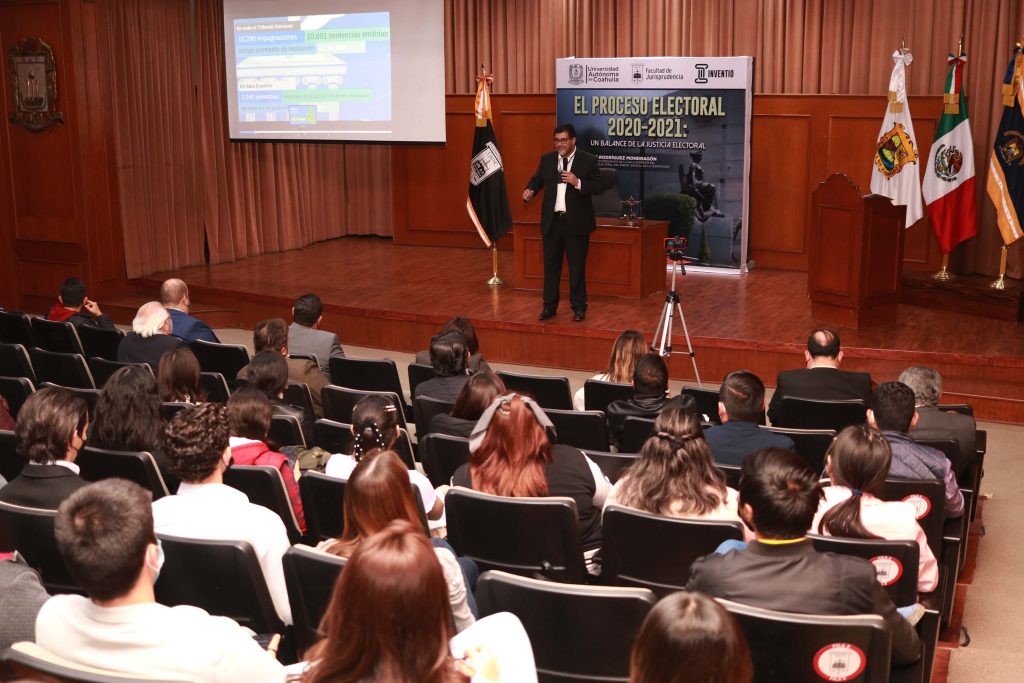 En la Facultad de Jurisprudencia de la Universidad Autónoma de Coahuila, se impartió la conferencia magistral “El proceso electoral 2020-2021: Un balance de la justicia electoral” a cargo del Magistrado Presidente de la Sala Superior del Tribunal Electoral del Poder Judicial de la Federación, Reyes Rodríguez Mondragón, esto como parte de las actividades del Ciclo de Formación Continua 2022, impulsado en el plantel.