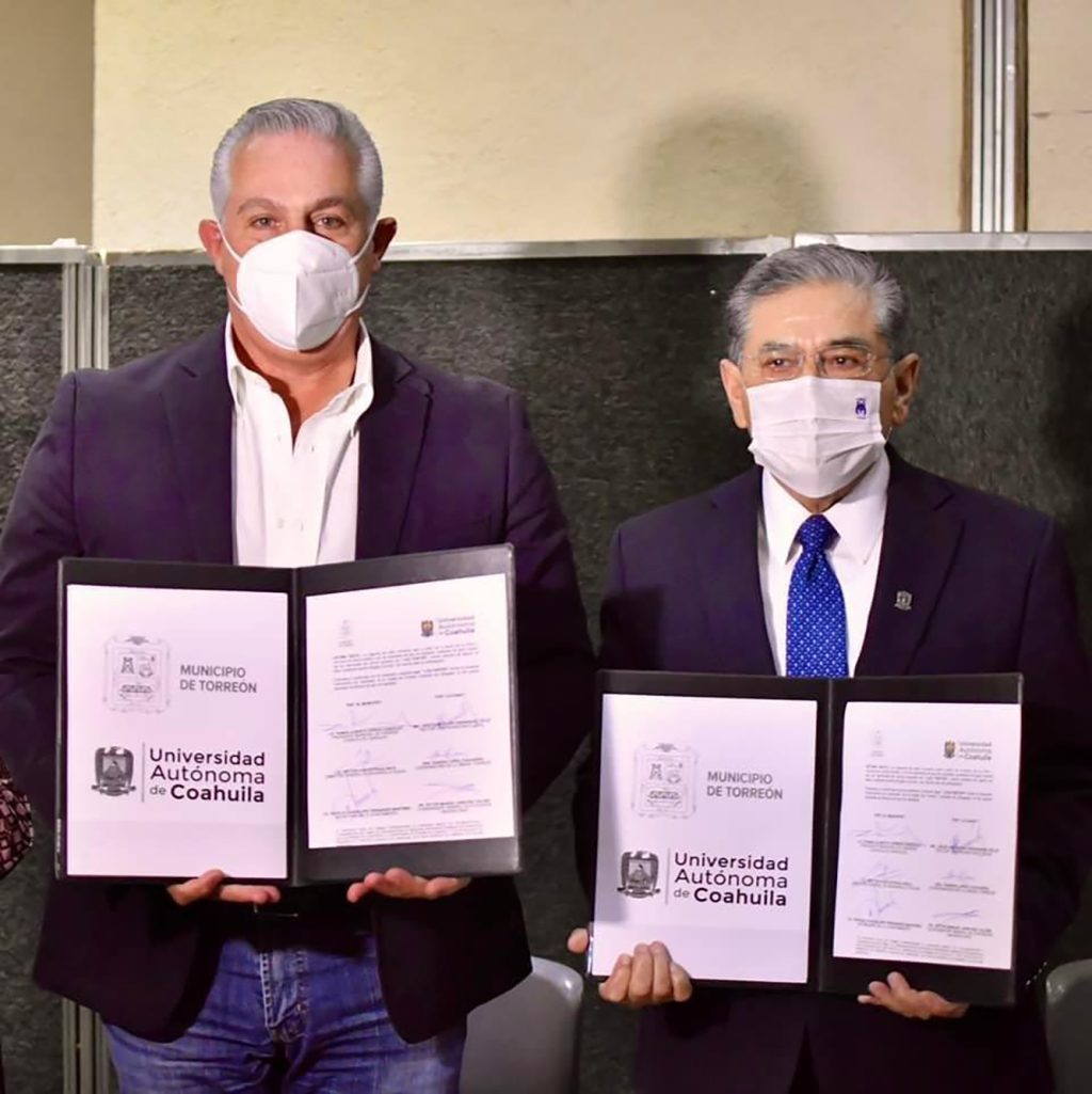 La ceremonia se llevó a cabo en la Infoteca “León Felipe” de Ciudad Universitaria de Torreón, donde signaron el documento el rector de la máxima casa de estudios, Salvador Hernández Vélez y el alcalde de Torreón, Román Alberto Cepeda González, acompañados por la coordinadora de la Unidad Torreón, Sandra López Chavarría, el coordinador general de Extensión Universitaria de la UA de C, Víctor Manuel Sánchez Valdés, el titular de Desarrollo Social del municipio, Héctor Iván Estrada Baca, representantes del sector privado, así como comunidad universitaria.