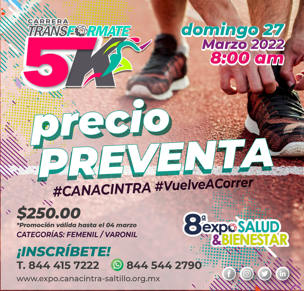 La CANACINTRA Coahuila Sureste informó que ya se encuentran abiertas las inscripciones para la segunda edición de la carrera Transfórmate 5K, misma que se llevará  a cabo el próximo 27 de marzo a las 8:00 de la mañana en el marco de la Octava Expo Salud y Bienestar 2022, y en la que se espera la participación de al menos 500 corredores.