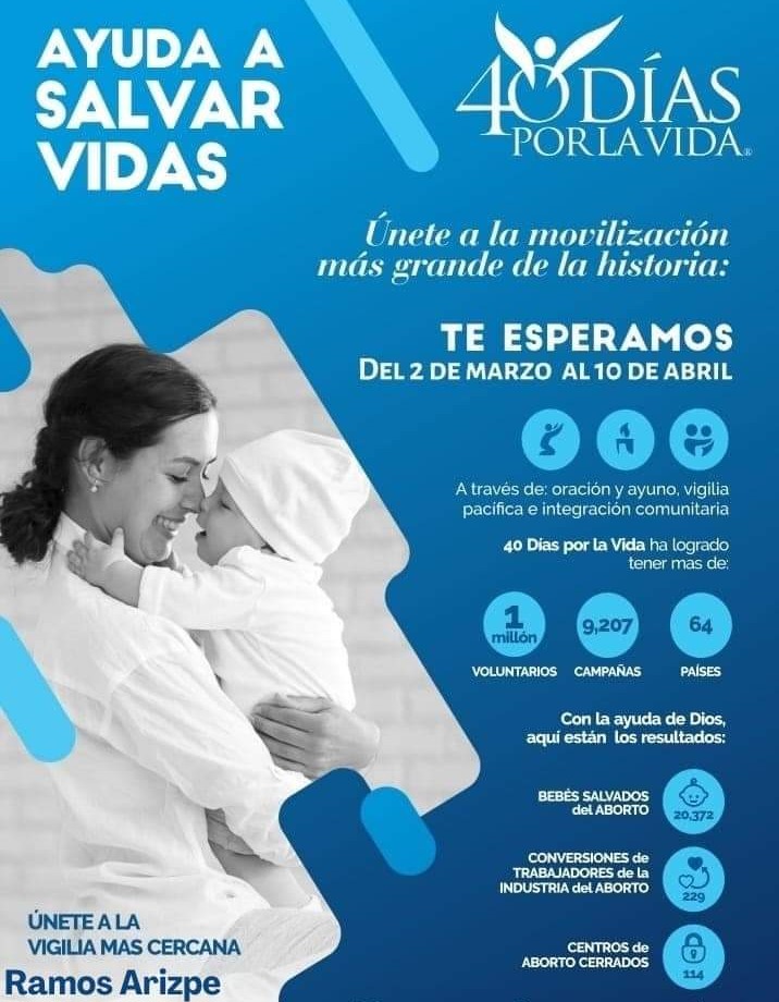 El próximo 2 de marzo, con el inicio de la Cuaresma, dará inicio en la vecina ciudad de Ramos Arizpe la campaña denominada “40 días por la vida”, cuyo propósito es el de unir al mayor número posible de personas a través de jornadas de oración para pedir por el fin del aborto, y la conversión de los trabajadores de la salud que se dedican a esta práctica, así como por el cierre de establecimientos en que se lleva a cabo.