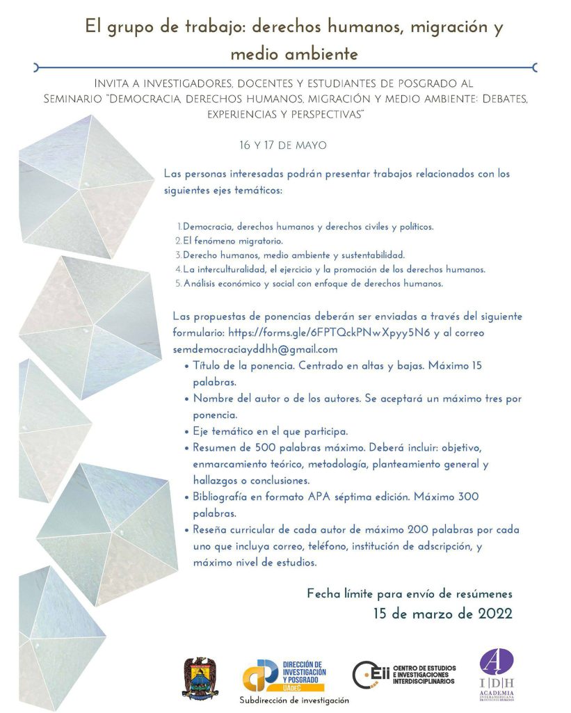 El Grupo de Trabajo: Derechos humanos, migración y medio ambiente de la Academia Interamericana de Derechos Humanos de la Universidad Autónoma de Coahuila, invita a investigadores, docentes y estudiantes de posgrado a participar en el Seminario «Democracia, derechos humanos, migración y medio ambiente: debates, experiencias y perspectivas», que se llevará a cabo el 16 y 17 de mayo de 2022.