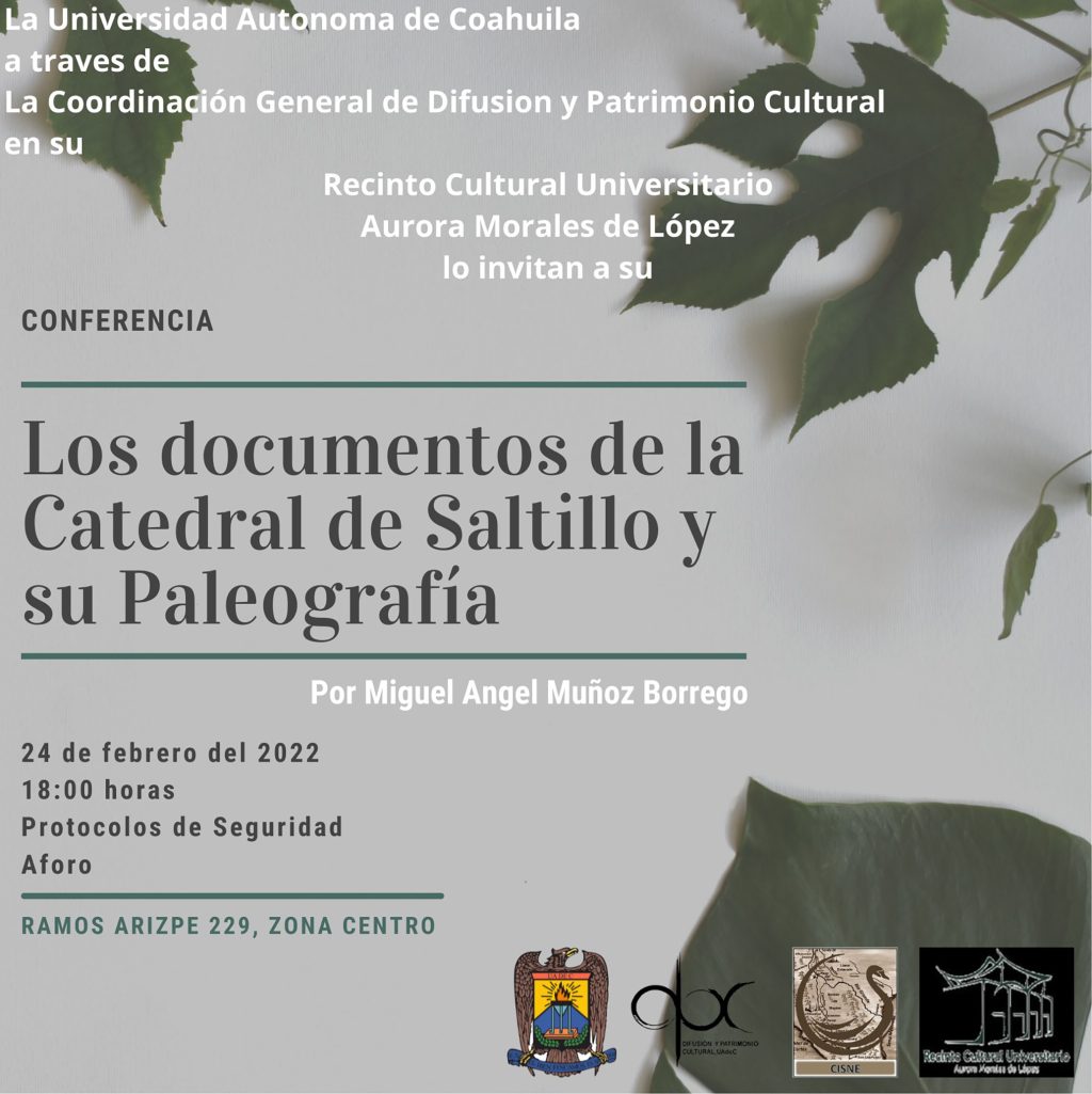 La Coordinación General de Difusión y Patrimonio Cultural de la Universidad Autónoma de Coahuila, invita a la charla sobre “Los documentos de la Catedral de Saltillo y su Paleografía”, que se llevará a cabo este jueves 24 de febrero a las 18:00 horas en el Recinto Cultural Universitario “Aurora Morales de López”, ubicado en la calle de Ramos Arizpe número 229 en el Centro Histórico de la ciudad; la entrada es libre.