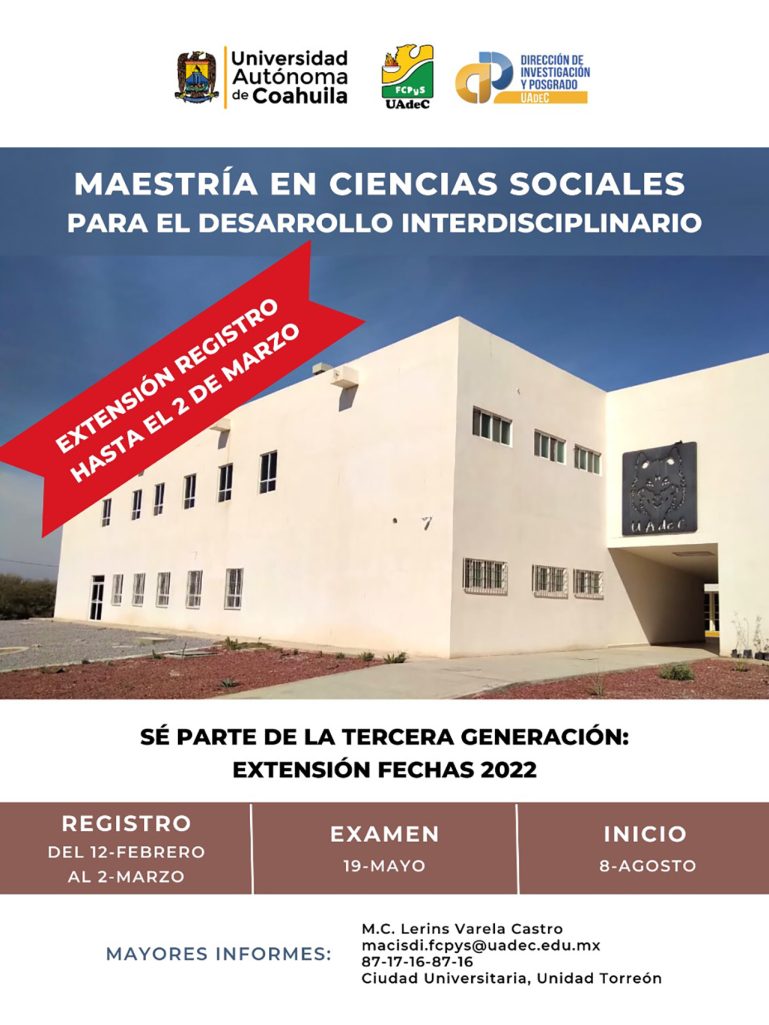 Para más información sobre el programa y requisitos de inscripción, comunicarse a la Coordinación de la Maestría en Ciencias Sociales para el Desarrollo Interdisciplinario de la Facultad de Ciencias Políticas y Sociales UAdeC Unidad Torreón, en la dirección electrónica macisdi.fcpys@uadec.edu.mx o llamar al teléfono (844) 871 716 87 16, o bien, visitar el plantel ubicado en Ciudad Universitaria UT, Carretera Torreón – Matamoros km. 7.5, Ejido El Águila. (EL HERALDO)