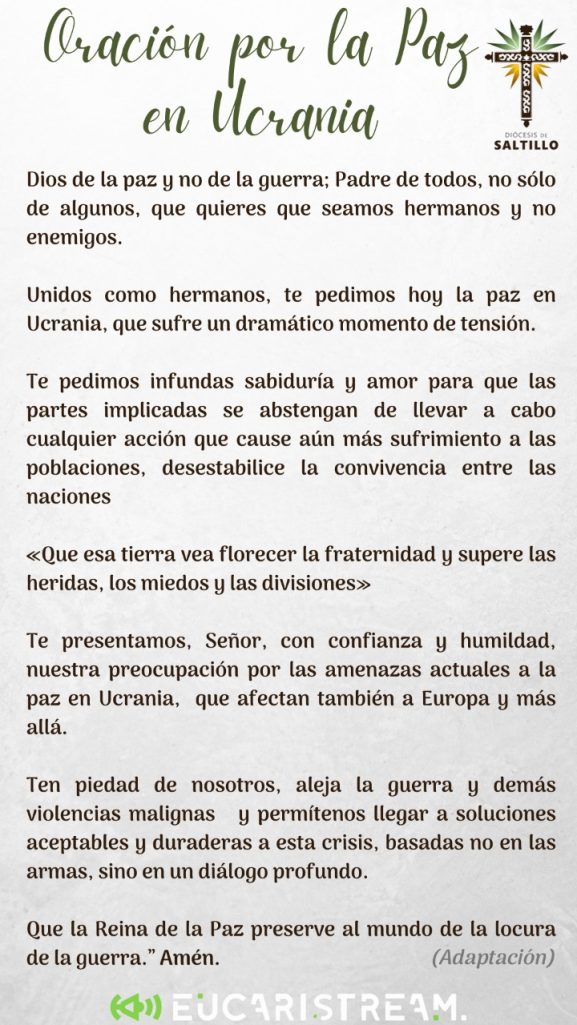 Tras darse a conocer que el presidente de Rusia, Vladimir Putin, ordenó este jueves (tiempo de Rusia) el despliegue de operaciones militares en la región de Donbás, al este de Ucrania, lo que derivó en el reporte de fuertes explosiones en ciudades del segundo país como Kiev y Kramatorsk, la Diócesis de Saltillo, por medio de una circular, pidió por la paz entre ambas naciones.