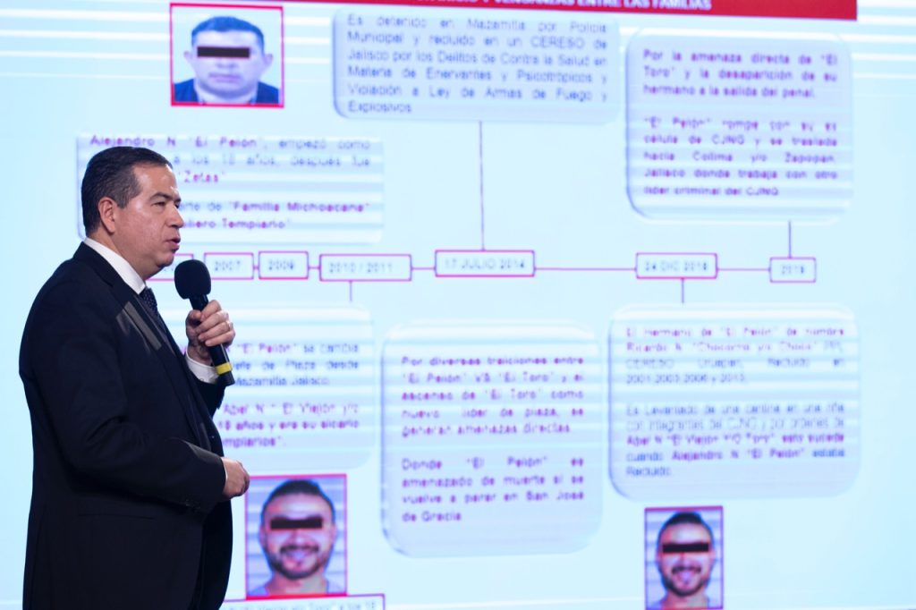 “El móvil que hemos ubicado es una posible venganza entre grupos vinculados a la delincuencia organizada, que dependen de la misma estructura criminal conocida como Cártel Jalisco Nueva Generación. Es decir, una diferencia de carácter familiar y personal entre la cabeza de dos células, uno que podemos ubicar como Alejandro, alías ‘El Pelón’, y otro ubicado como Abel, alias ‘El Toro’ o ‘El Viejón’, ambos oriundos de San José de Gracia con familias arraigadas en esa demarcación. Ambos pertenecieron primero como el grupo conocido como Los Templarios y después al Cártel Jalisco Nueva Generación”, afirmó el subsecretario.