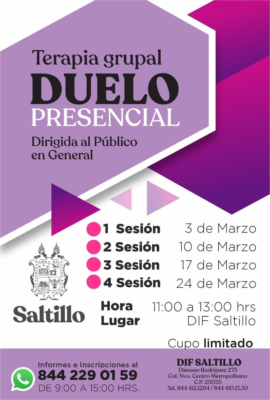 La Terapia está dirigida al público en general y se llevará a cabo durante cuatro sesiones los días 3, 10, 17 y 24 de marzo, en horario de 11:00 a 13:00 horas en las instalaciones del DIF Saltillo.