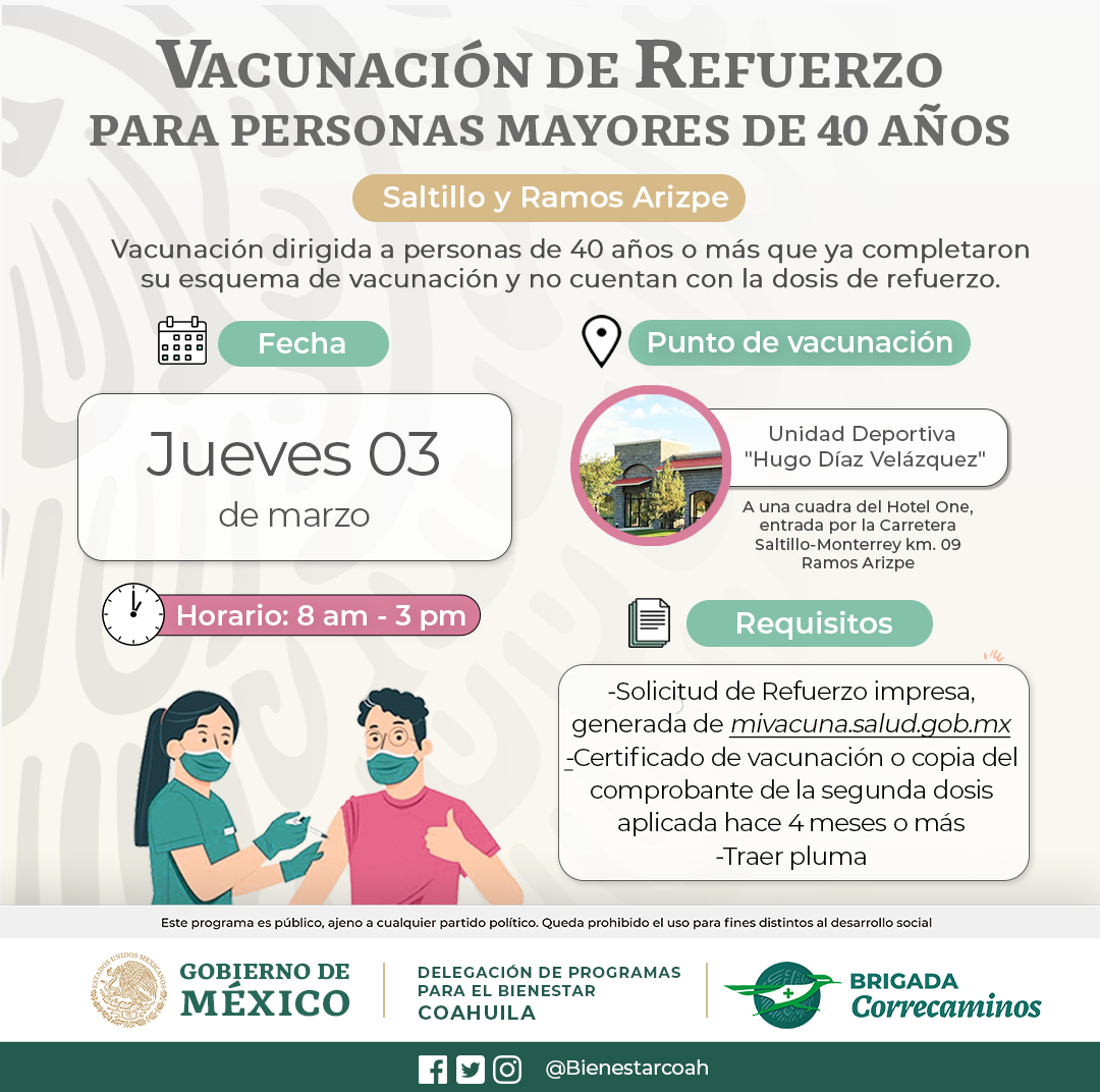 La Delegación Coahuila de la Secretaría del Bienestar informó que este jueves se aplicarán vacunas de refuerzo a mayores de 40 años de Saltillo y Ramos Arizpe, que ya completaron su esquema de vacunación y no cuentan con esta dosis de refuerzo.