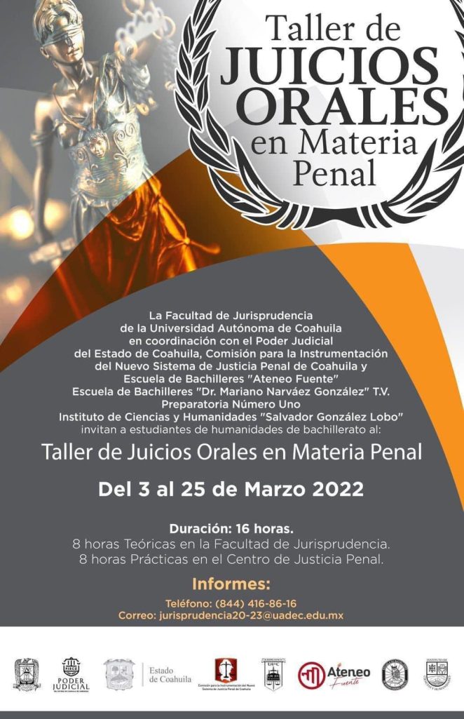 La Facultad de Jurisprudencia de la Universidad Autónoma de Coahuila, invita a estudiantes de bachillerato de la Unidad Saltillo, a participar en el Taller de Juicios Orales en Materia Penal, que se llevará a cabo del 3 al 25 de marzo de 2022.