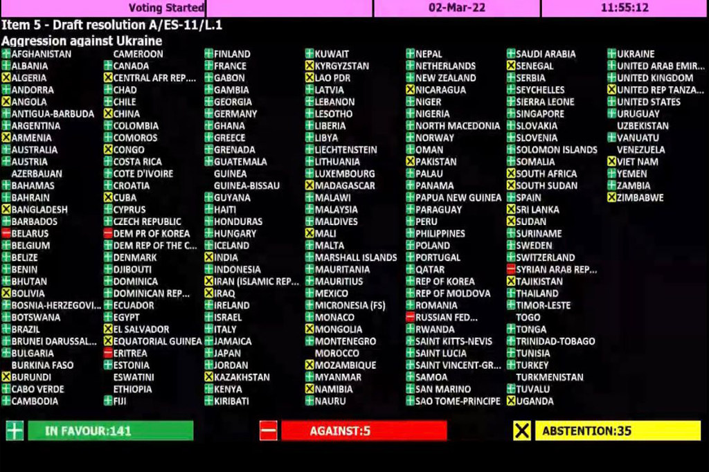 El documento, patrocinado por unos 90 países, obtuvo 141 votos a favor, cinco en contra y 34 abstenciones. El voto se llevó a cabo luego de más de dos días de un debate en el que casi 120 representantes coincidieron en la necesidad de una solución pacífica a la crisis, aunque desde diferentes perspectivas.