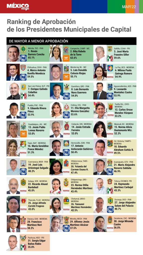 Son @RenanBarrera, @bibyrabelo, @jm_fraustro, @soyMarcoBonilla y @colosioriojas los Presidentes Municipales mejor evaluados; mientras que @_JorgeMirandaC y @sergiobanosr son los peor evaluados, según la última encuesta de #MxElige. pic.twitter.com/HMloFj5nNS