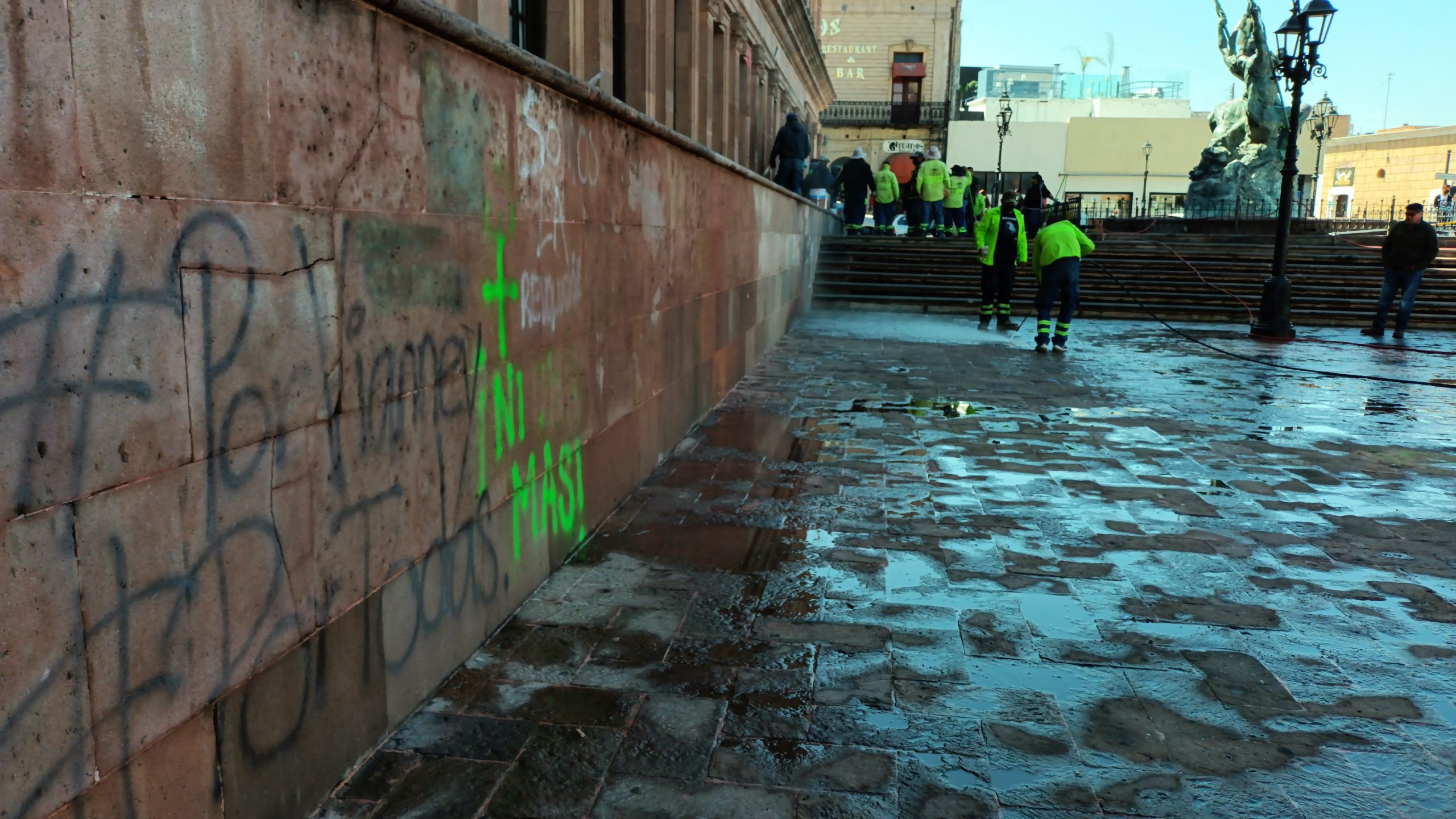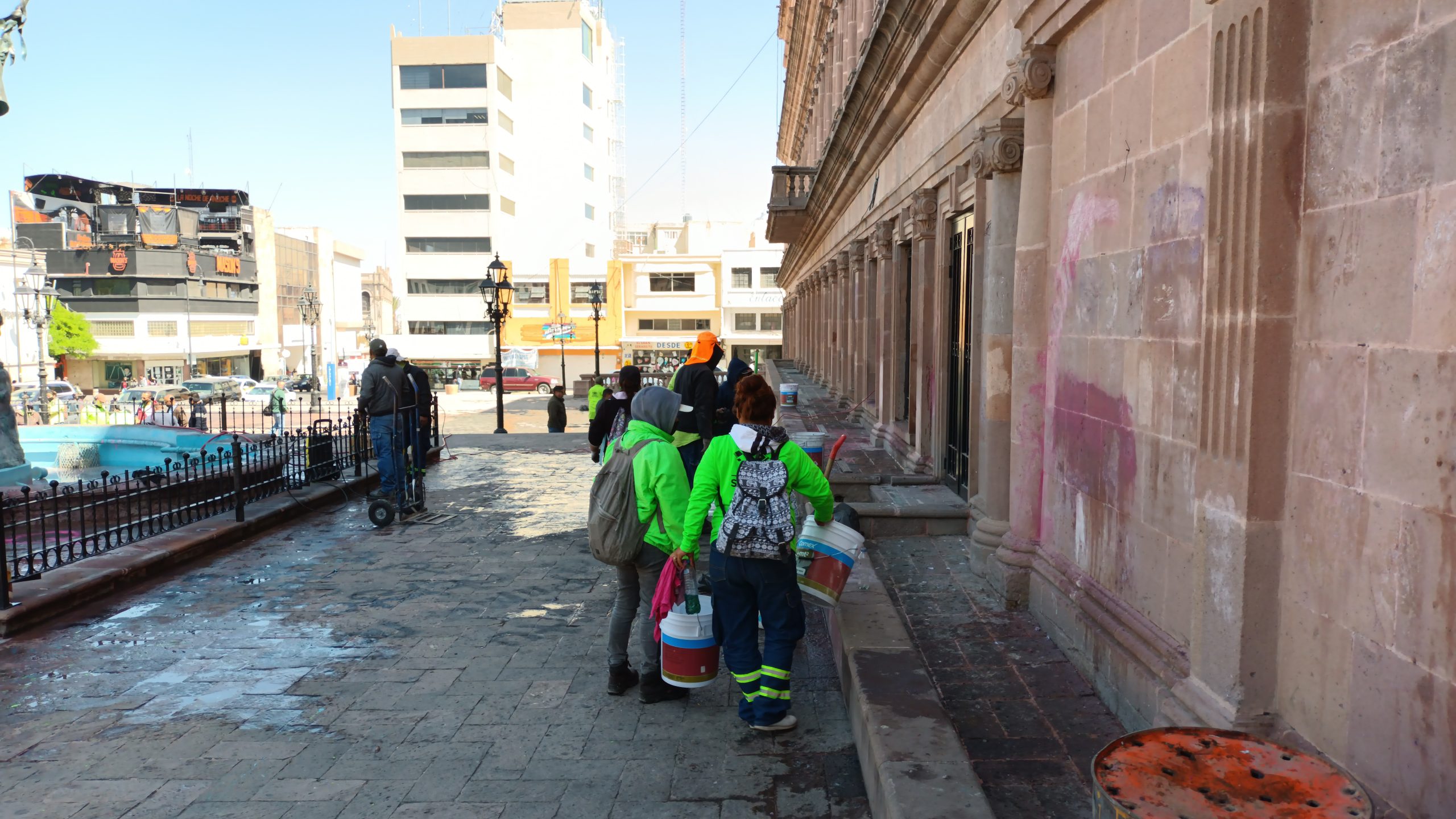Una cuadrilla de alrededor de 20 trabajadores de la Dirección de Servicios Primarios de Saltillo se concentró este miércoles en la plaza de la Nueva Taxcala para llevar a cabo labores de limpieza y retiro del grafiti y papeles adheridos en Palacio de Gobierno y en otras áreas de ese espacio público, luego de la marcha feminista que tuvo lugar por el Día Internacional de la Mujer.